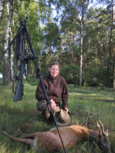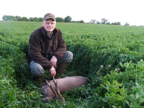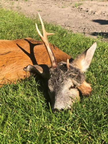 Tidlig morgen afgang fra hotellet kl. 3:45. Igen er vi rundt på reviret uden at se ret meget. Dyrene virker sky og meget årvågne, måske på grund af bøndernes aktivitet aftenen før. På vej hjem i bilen på ca. 600 m afstand ser vi en rå og en buk der esser i kanten mellem en græsmark og en høj rugmark. Vi kører et stykke tilbage og går stille gennem et lille skovstykke og kommer en del tættere på. Jeg afgiver skud fra skovkanten fra skydestok med højre skulder mod et træ, afstanden var pænt stor. Bukken går ned på stedet. For første gang får jeg lov til at hjælpe med at bære bukken ud til bilen.